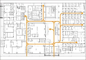 対象となる建物の利用目的を把握した上で、外部、内部とも、人の流れ(導線)の把握を行います。人や車が、何の目的で、どの部分に移動して行くのか、そのパターンは何通りあるのか。
